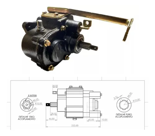 Caixa de redução tipo coaxial indicado para equipamentos Rodomoto. É possível acionar o reduzido através da alavanca com cabo de aço.